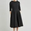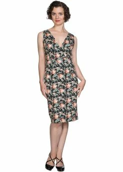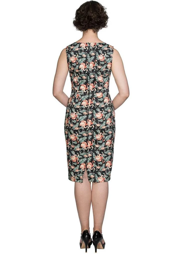 This extraordinarily good flamingo print has an attached wrap by the chest on a bodice which is beautifully formfitting because of the figure- and coupe seams. The waist is accentuated by the seam, down from which she continues into a playful pencil skirt which with a height of 1,70 reaches down above the knee. She’s made of a beautiful cotton-mix with a slight stretch, for that Vavavoom ๐ She closes with a zipper on the back where she also has a slit.