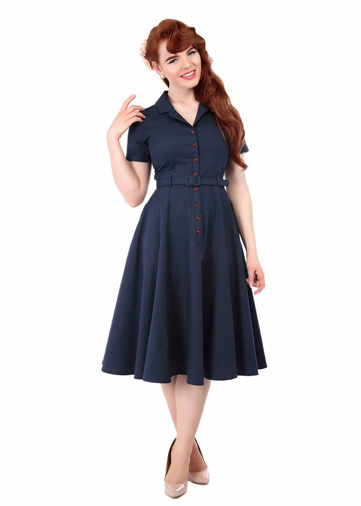 This beauty looks lovely summery thanks to the airy structure and gorgeous olive colour. The beautiful quality cotton has a slight stretch and feels like a dream to wear. She can be closed with the buttons on the front for a timeless shirt-look. The waist is accentuated by the belt, and downwards she flares out into a full swing skirt which is perfect for combining with one of our petticoats. She even has little pockets!