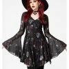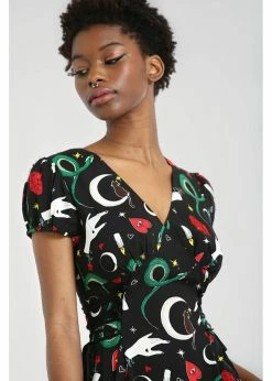 Snakes, fortune teller’s hands and black cats, they’re all there on a background of black viscose. There are seams running from the v-neck underneath or over the chest, for a classic vintage look. The short sleeves are playfully puffy thanks to the gatherings at the shoulders.