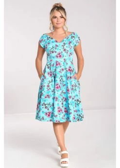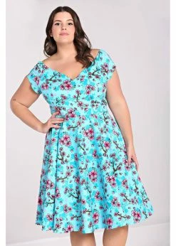 With her fresh print, wide neckline and cap sleeves, she could have come right out of the 50’s.