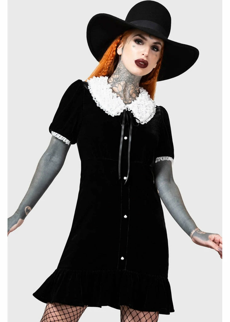 The blacker-than-black velvet is incredibly soft and has fine stretch, which makes her a dream to wear. The countless white ruffles on the collar seem innocent, which also comes back on the short puffy sleeves.
