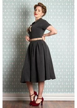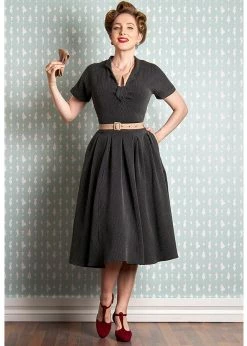 The waist is accentuated with the removable belt, before she flares from inverted pleats into a full skirt with pockets. Stunning with one of our petticoats, but she’s just as gorgeous by herself. For a height of 1.70m, she ends below the knees and she closes with a zipper on the side.