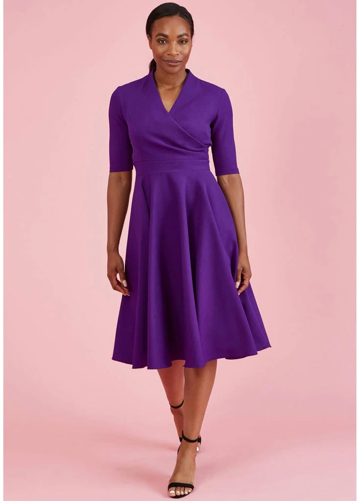 Your slimmest part is accentuated by the waistband and the pleats that run from the overlap towards the side seam, from where she flares into a full circle skirt with pockets that you can beautifully wear with one of our petticoats for the perfect 50’s look. She closes with a zipper and for a height of 1.70 m, she ends below the knees. Pretty Dress Company is made in the UK.