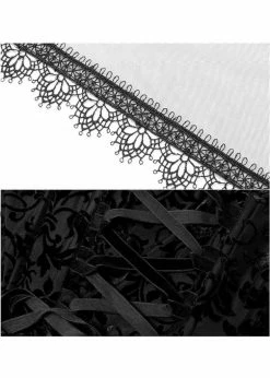 How incredibly enticing the bodice is with the padded cups that were inspired by wings, and of course the breathtaking velvet flowers on the smooth fabric with fine stretch… Thanks to the decorative lacing in the back and the boning, she’s Vavavoom closefitting. The slim shoulder straps are adjustable and removable.