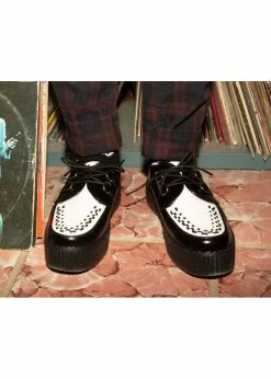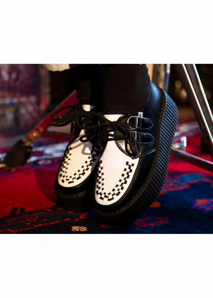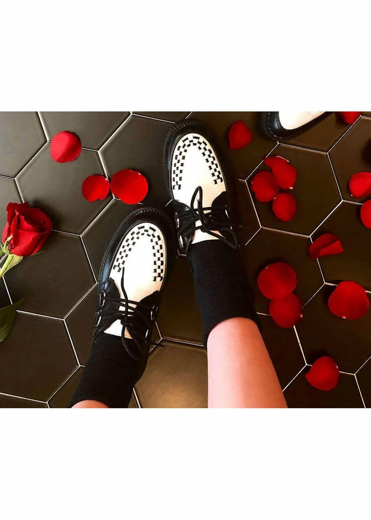 T.U.K takes care of our ladies and gents with these gorgeous pieces of real leather with the popular creeper sole of 5 cm at the heel and 4 cm in the front. The shoe closes with a lace that runs through D-rings. The genuine leather is great to wear and the sole is nicely smooth. And they have another twist, the bottom is covered with bones!