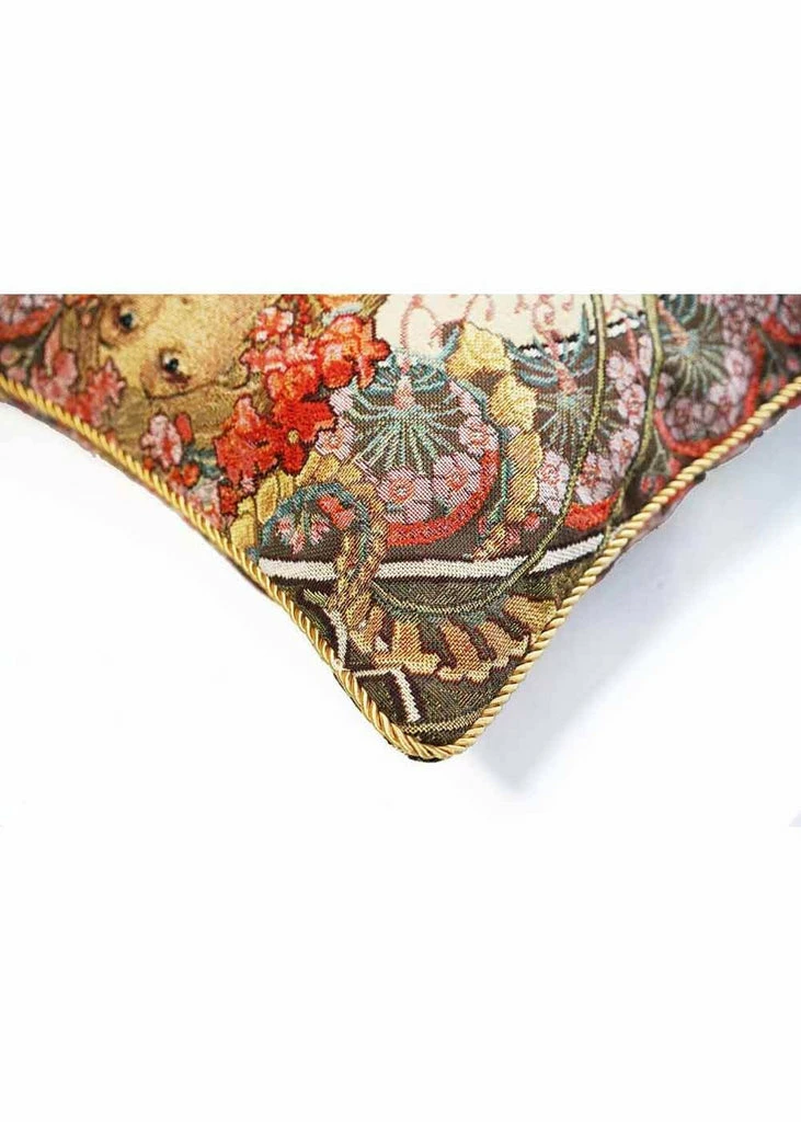 Both sides of this pillow case are showing ‘Daydream’ by Alphonse Mucha. It’s made of a heavy gobelin cotton mix, double stitched and has piped edges.