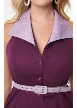 Jane blows everyone away with her retro purple cotton-mix with fine stretch. Her namesake is playfully embroidered on the skirt, look out! The big collar transforms into a halter and is decorated with a star print, just like the bottom seam.
